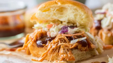 For a buffet setup, I like to keep the BBQ chicken warm in the slow cooker and set out the buns, coleslaw, and toppings separately so everyone can build their own.