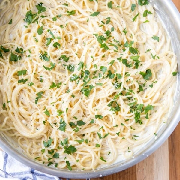 A simple, cheesy pasta that’s basically an elevated version of what you craved as a kid. Spaghetti tossed in a luscious cream cheese and Parmesan sauce.