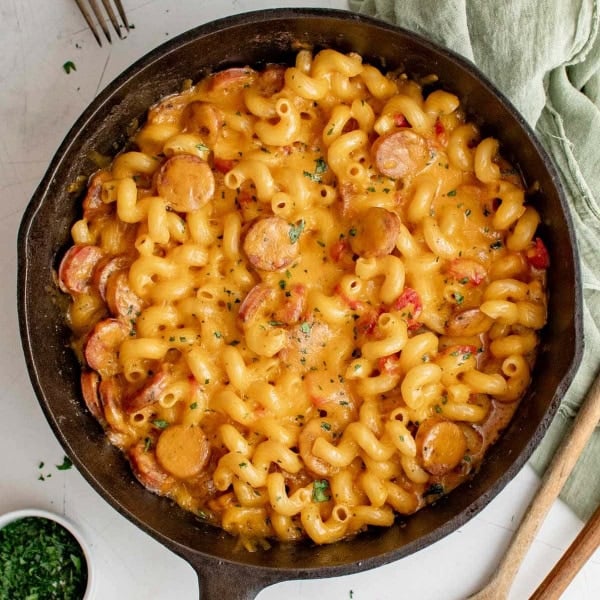 A one-pot mac and cheese with savory chicken apple sausage stirred right in. Creamy, cheesy, and hearty enough to be a full dinner.