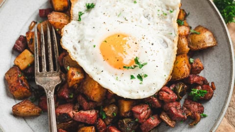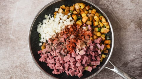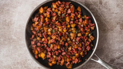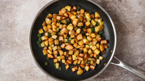 • Potato shortcut: Use leftover cooked potatoes or frozen diced potatoes to cut the cook time roughly in half. Just make sure to still let them brown in the pan.