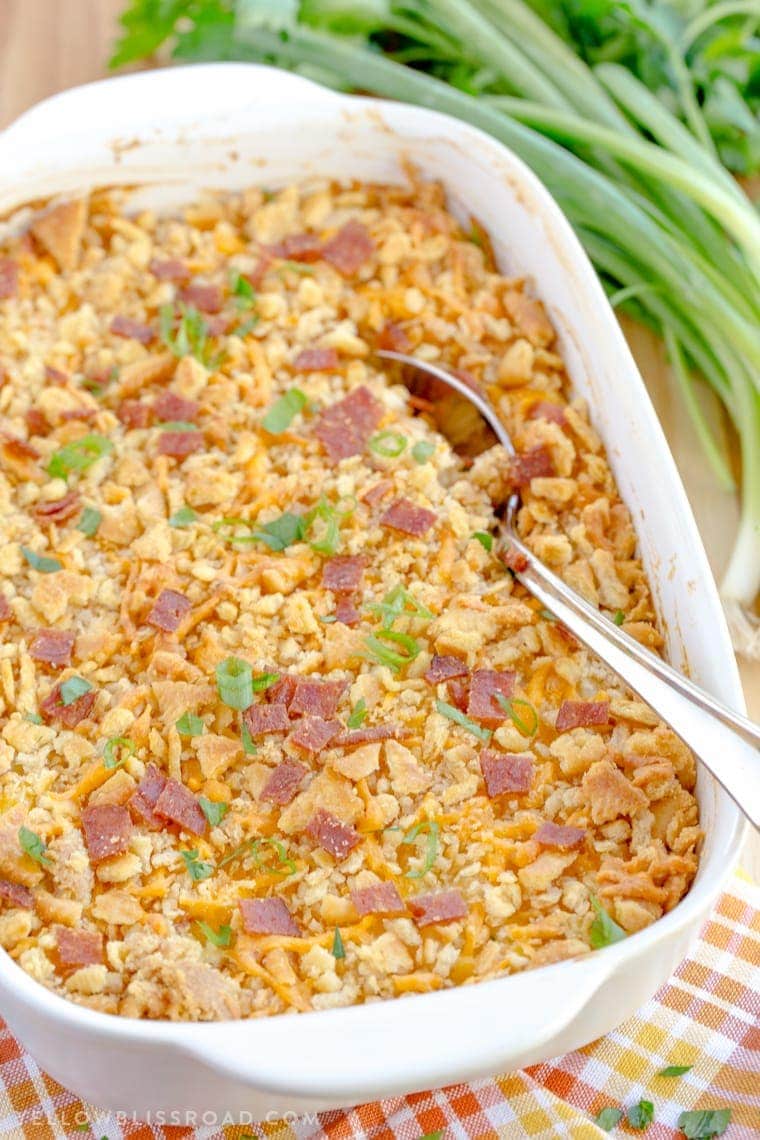 This Potato, Corn and Bacon Casserole is creamy and delicious and is a classic hash brown casserole taken up about 50 notches! It’s the perfect accompaniment to any holiday entree.
