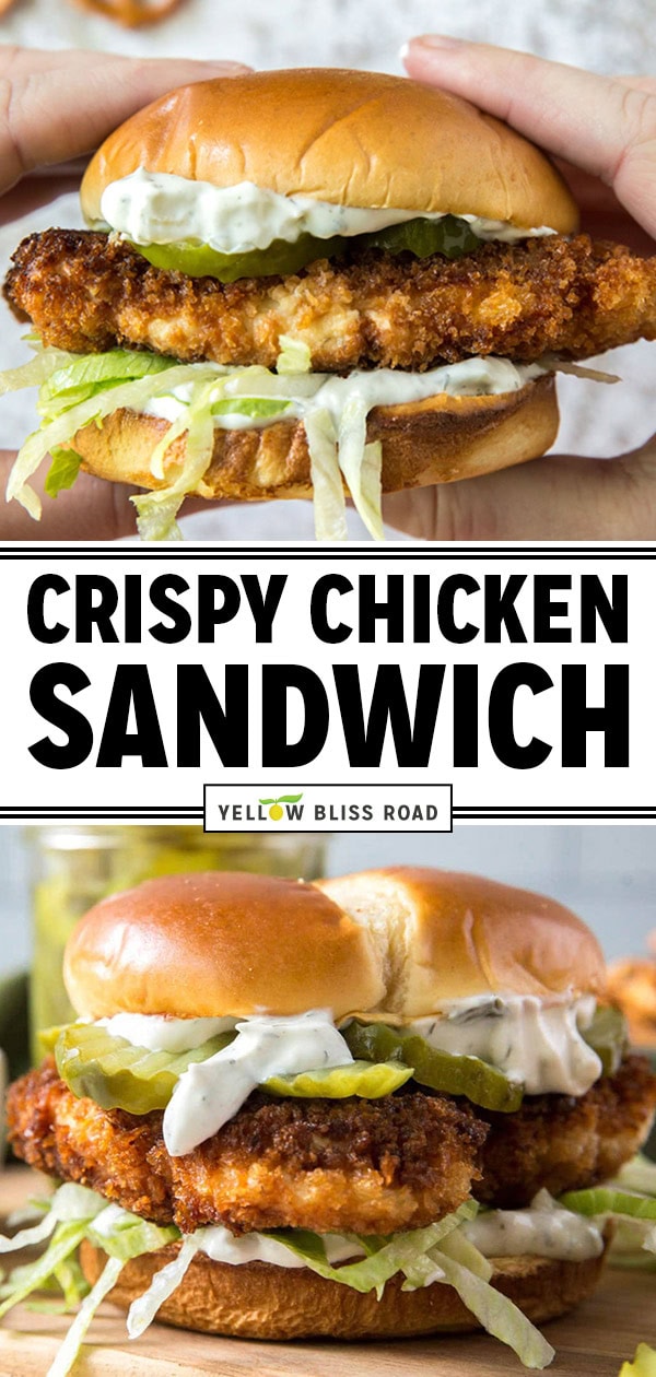 Skip the drive-thru line and learn how to make the best crispy chicken sandwich at home! Crispy baked or fried chicken seasoned with dill and piled high with lettuce and crunchy dill pickles, topped with a creamy Greek Yogurt Ranch sauce.