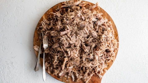 - Transfer the roast to a cutting board. Discard the bone (if using bone-in) and shred the meat with two forks, removing large chunks of fat as you go.
