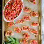 Creamy, rich goat cheese is the perfect contrast to the bright, acidic tomatoes in this outrageously delicious baked dip, served with crispy homemade Crostini.