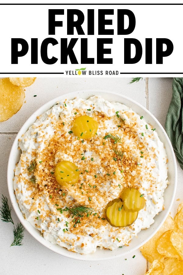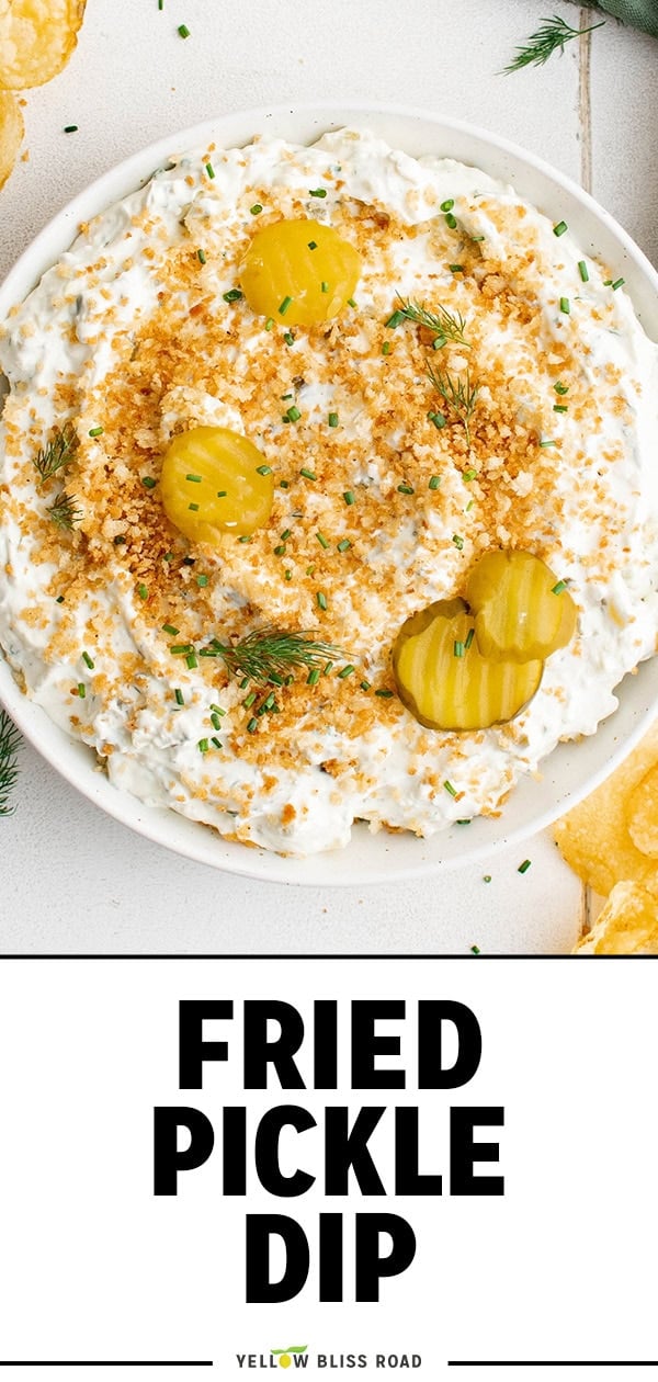 Garnish & Serve. Just before serving, garnish the dip with the breadcrumbs, a few dill pickle slices, and fresh herbs. Serve with potato chips, crackers, or veggies.