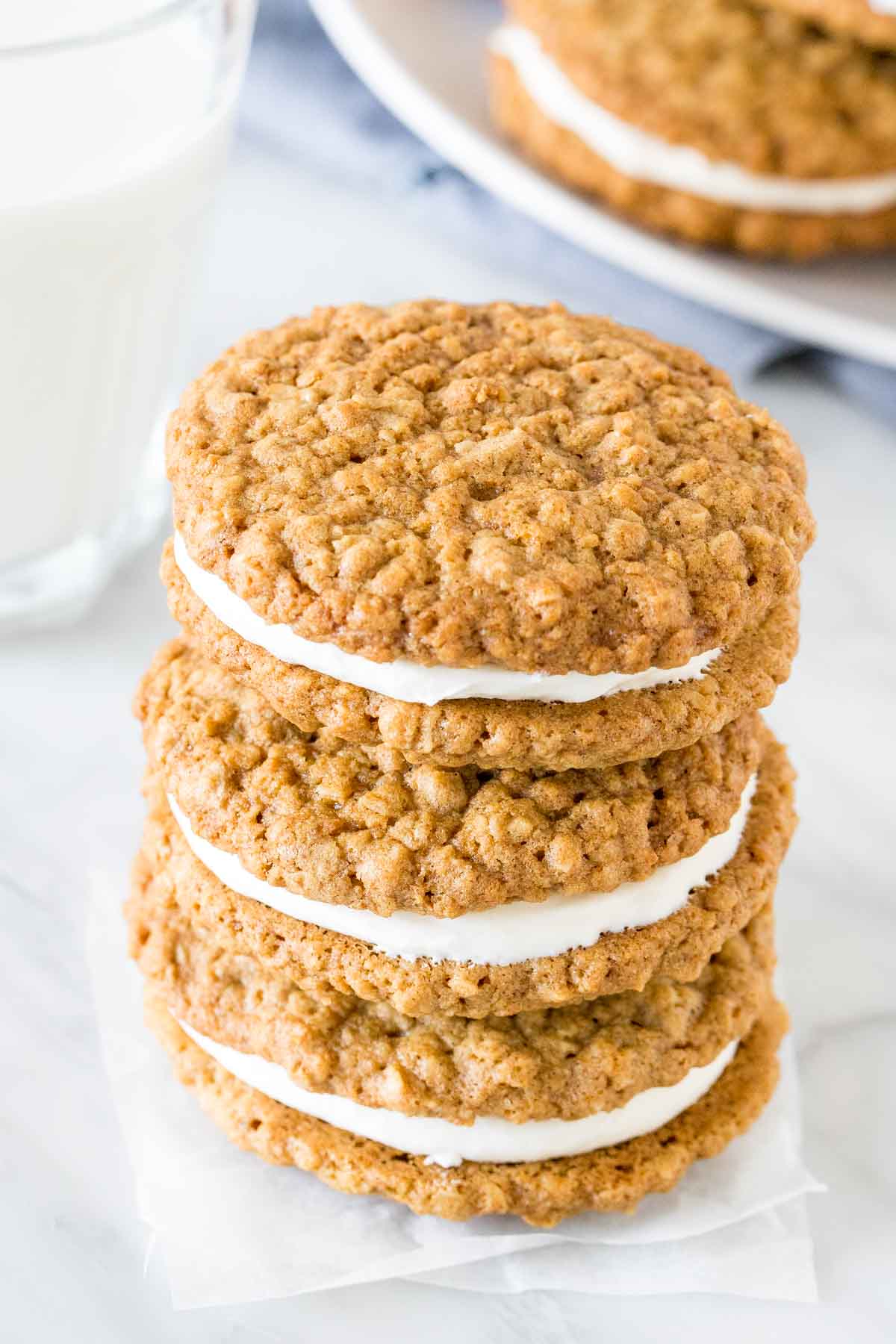 These cookies can be stored in an airtight container at room temperature for up to 3 days, or in the fridge for up to 5 days (although I doubt they’ll last this long). If your kitchen is warm, you may want to store them in the fridge. Unfrosted cookies can also be frozen. After the oatmeal cookies are fully cooled, place them in a freezer bag or freezer-safe container in single layers, with sheets of parchment paper in between each layer. Then thaw in the fridge. Do not freeze frosted Oatmeal Cream Pies.