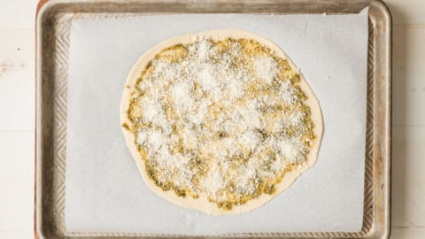 Dust your surface with flour, then divide the dough into four equal pieces. Roll the first into a 10-inch circle and place on a parchment-lined baking sheet. Spread with ⅓ of the pesto and ¼ cup parmesan, leaving a 1/4-inch border.