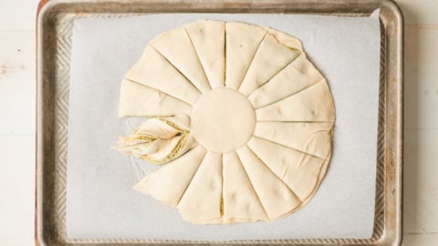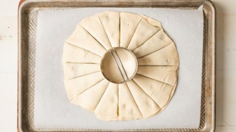 - Place a 3” round biscuit cutter (but do not down) in the center of the dough circle, which acts as a guide to make the star cuts. Using a sharp knife, make cuts through the layers to end with 16 total pieces for 8 twist pairs.