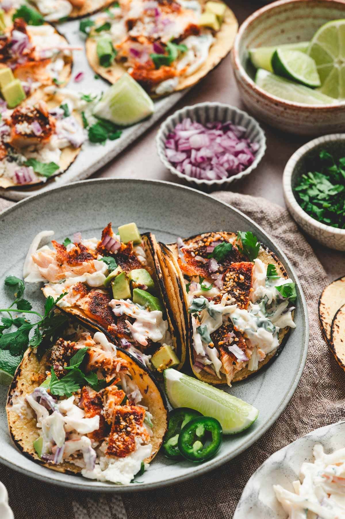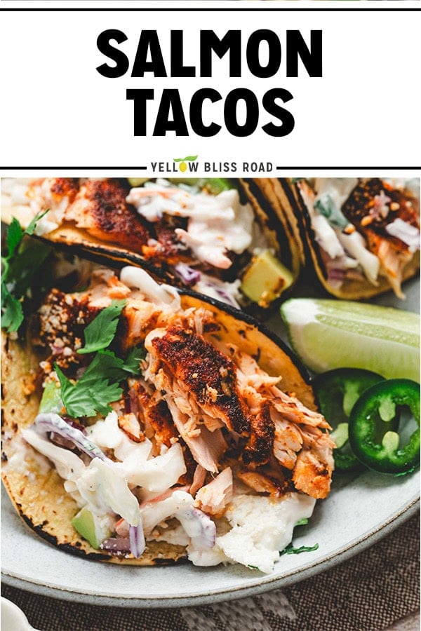 These salmon tacos are so easy to make and completely customizable with your favorite toppings. You can grill or bake the salmon, making this recipe perfect for making year-round.