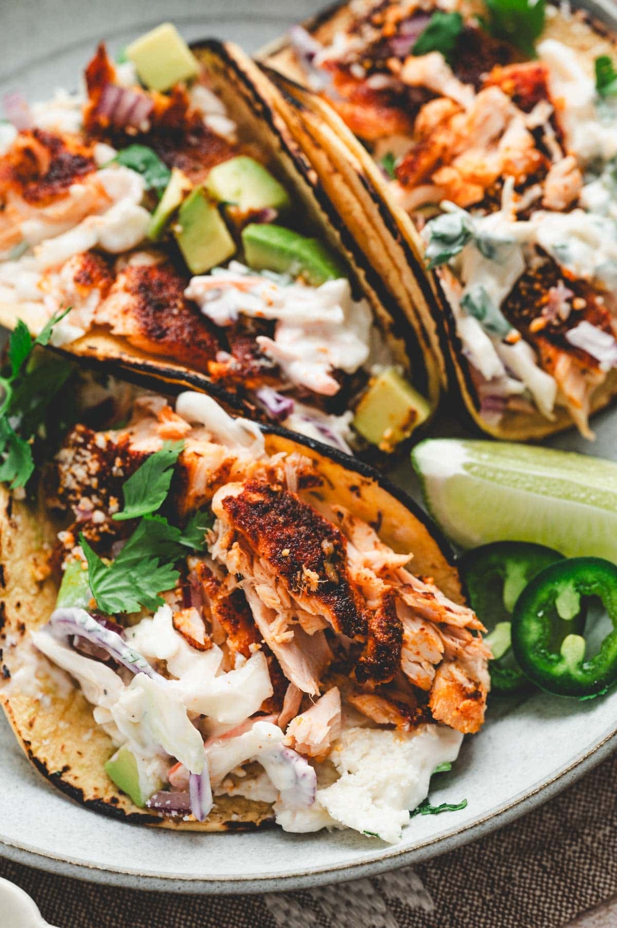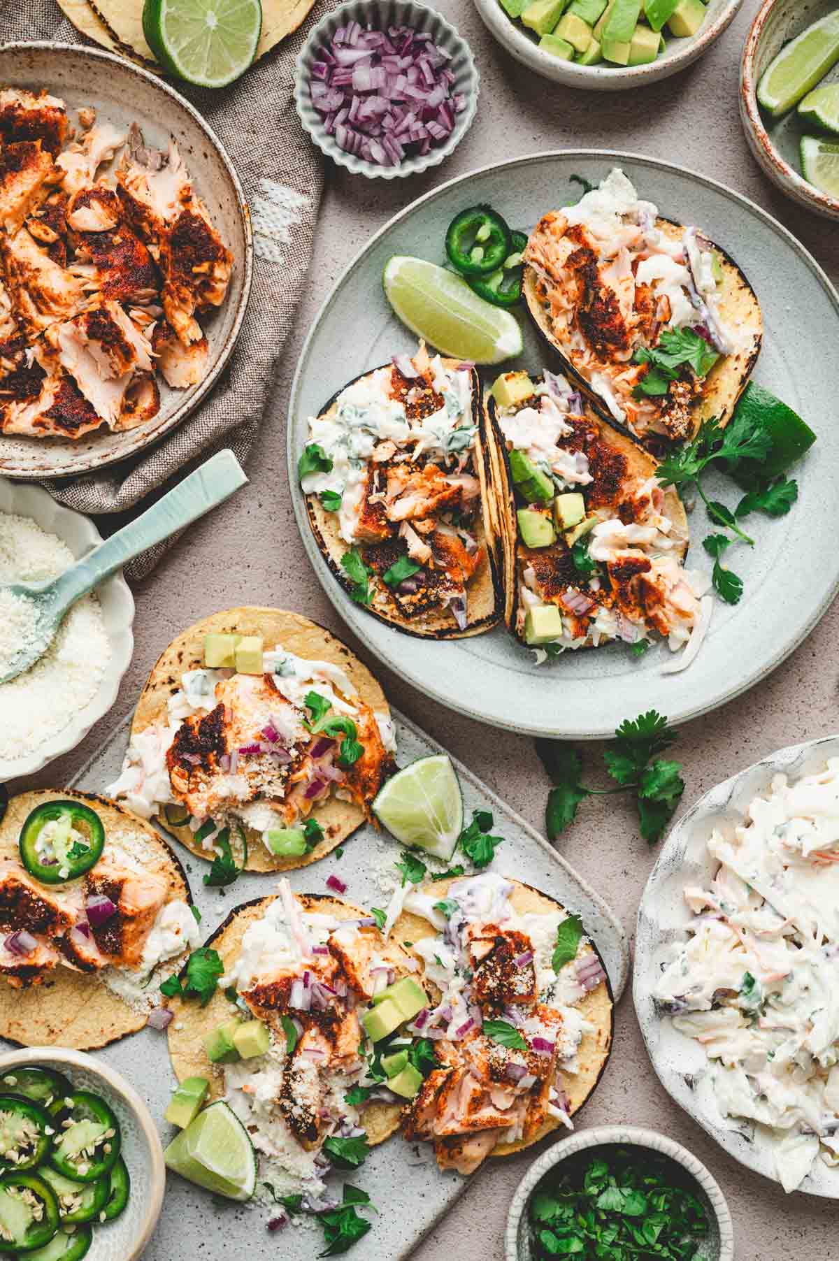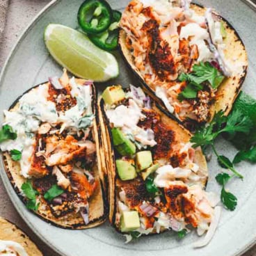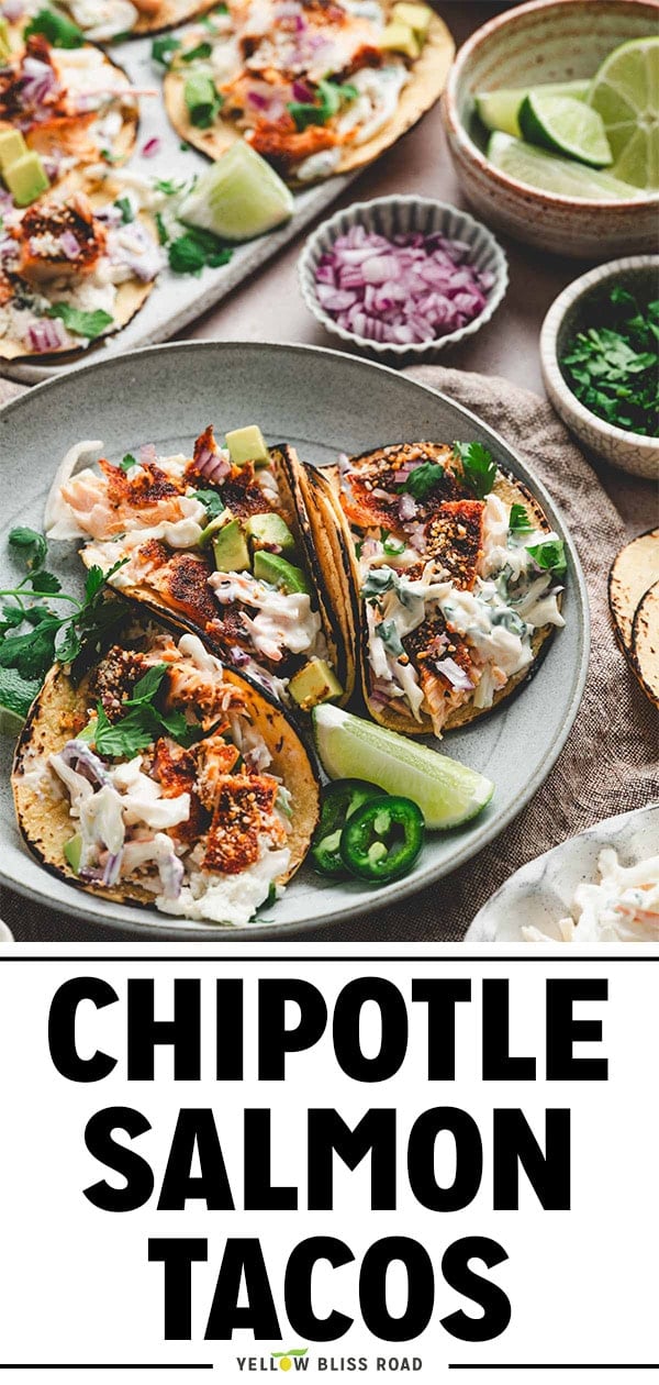 Chipotle Salmon Tacos have flaky, smoky salmon tucked into warm tortillas with a creamy, tangy slaw and all your favorite toppings. Salmon is seasoned with a bold blend of spices, then cooked to perfection in the oven or on the grill. This easy weeknight dinner is ready in just 45 minutes.