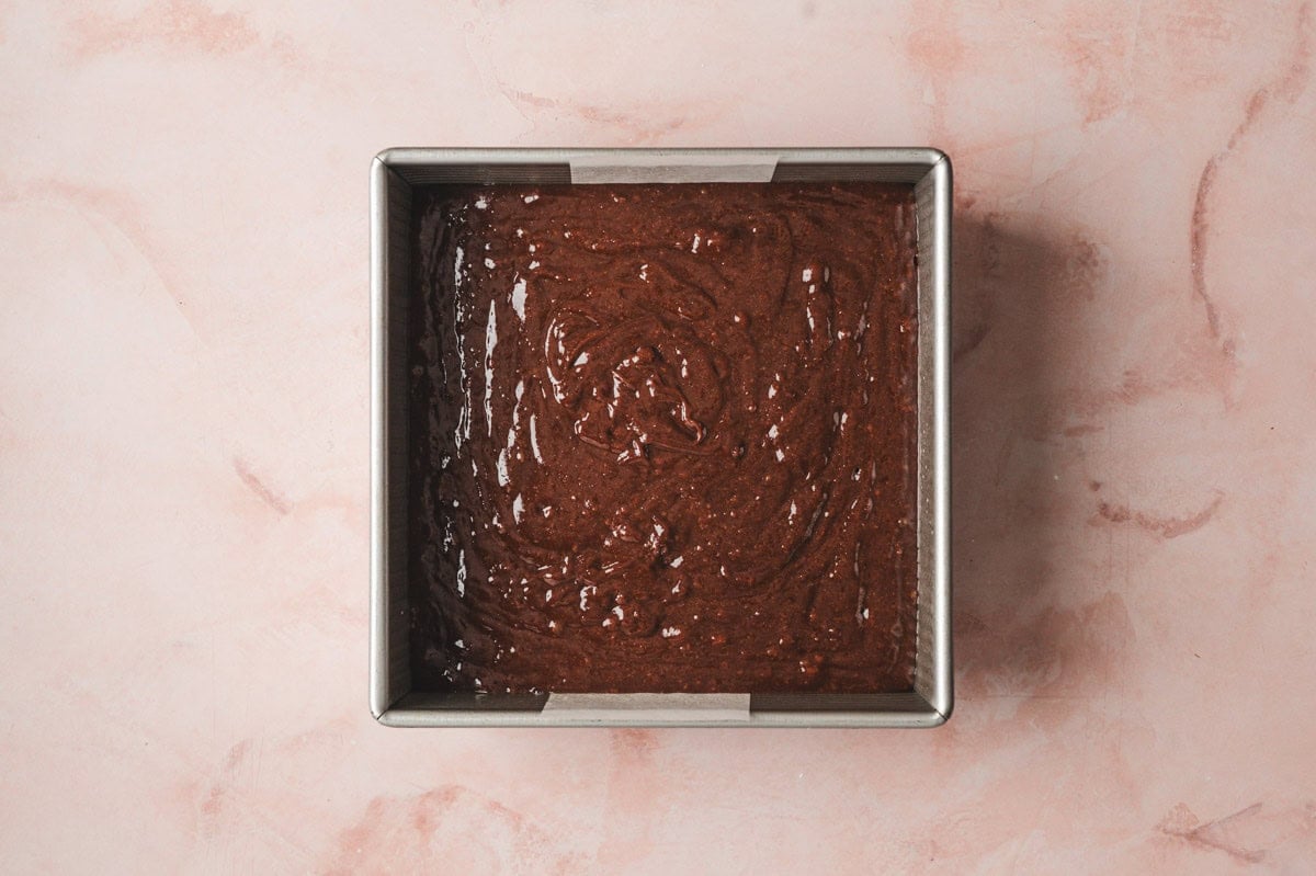Pour batter into a parchment-lined 8×8-inch pan and bake at 350°F for 30-35 minutes.