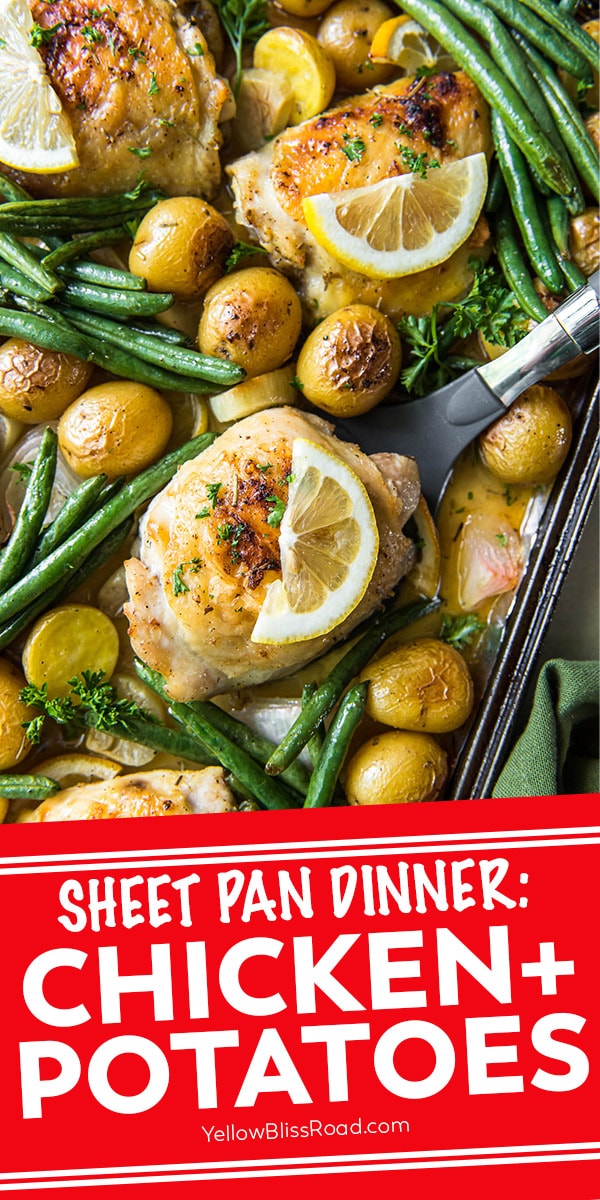 Sheet Pan Chicken and Potatoes is your new go-to easy weeknight dinner! Crispy roasted chicken thighs, potatoes and green beans are flavored with zesty lemon, garlic and herbs for a complete meal that will satisfy even the pickiest eaters.