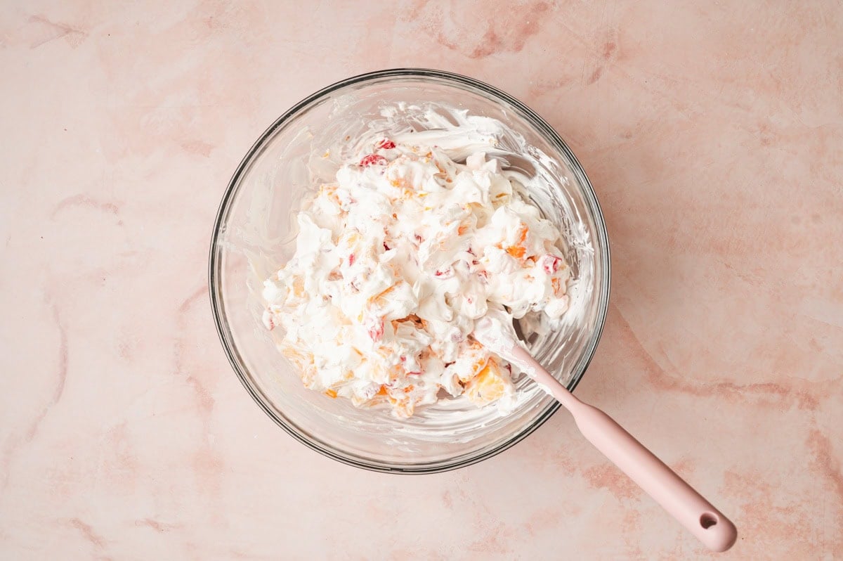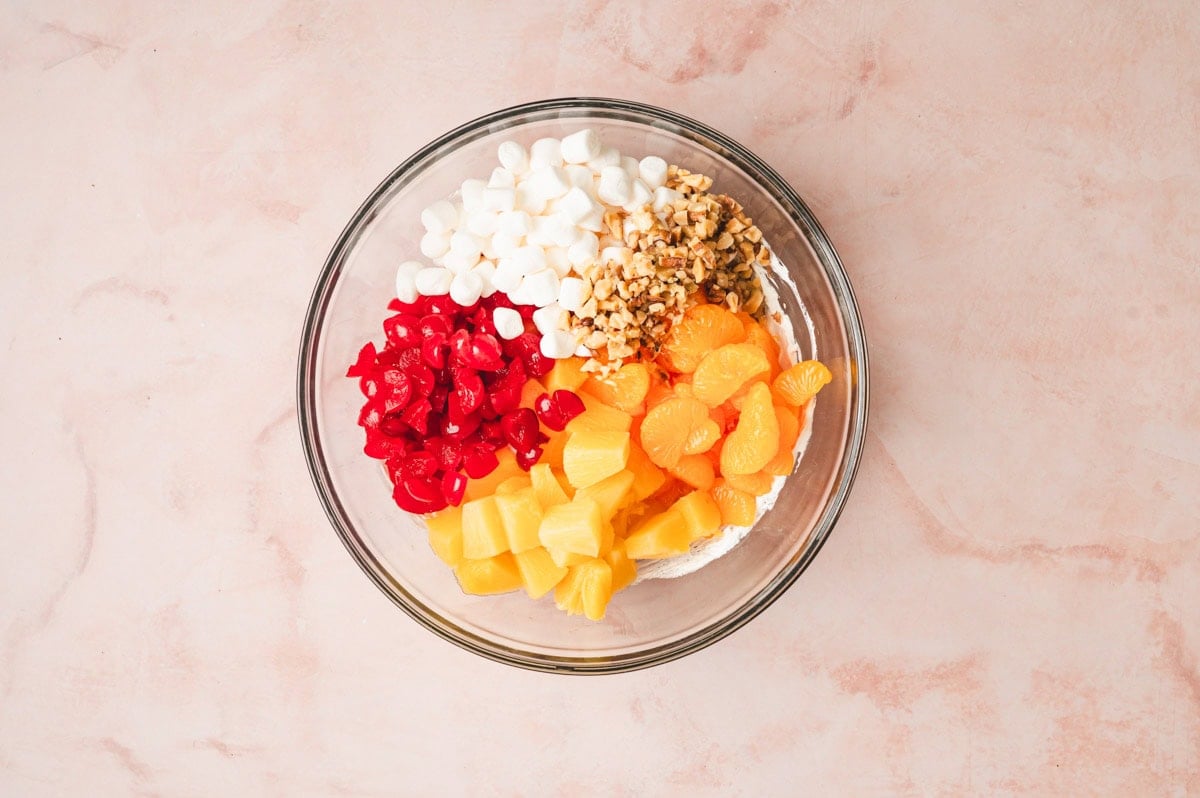 - Add fruits, marshmallows and nuts and fold together until mixture is combined.