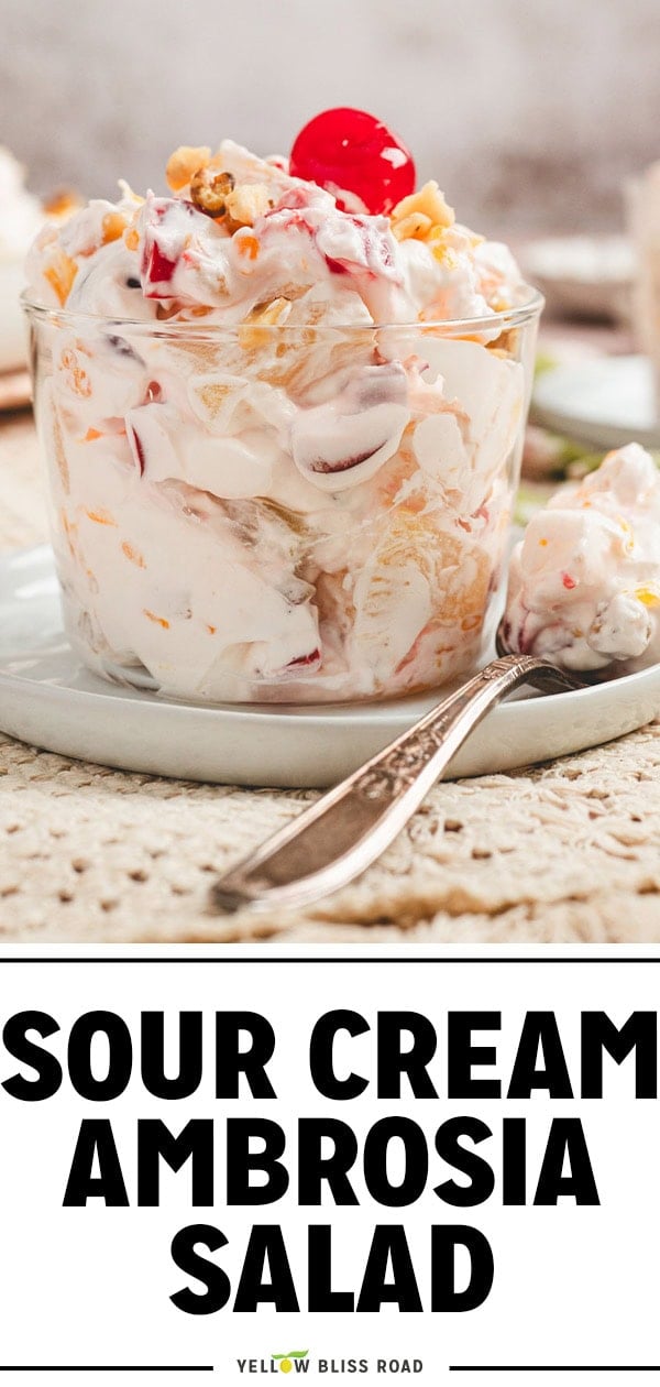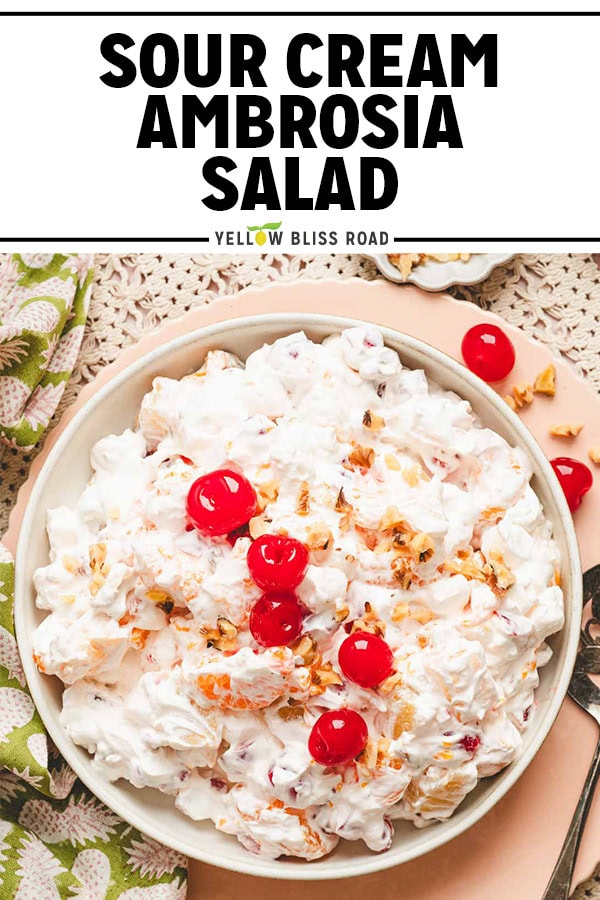 Sour Cream Salad is a family favorite and a version of Ambrosia Salad with mandarin oranges, pineapple, cherries, marshmallows, and walnuts in a creamy sour cream and Cool Whip dressing. It’s easy to make, perfect for holidays and potlucks, and the sour cream adds tang, so it’s not overly sweet.
