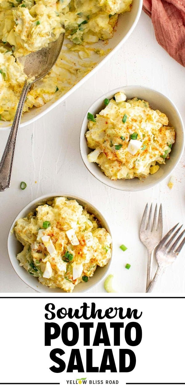 This old-fashioned Southern Potato Salad recipe has tender chunks of potato, hard-boiled eggs, and pickle relish with a creamy mayo-based dressing.