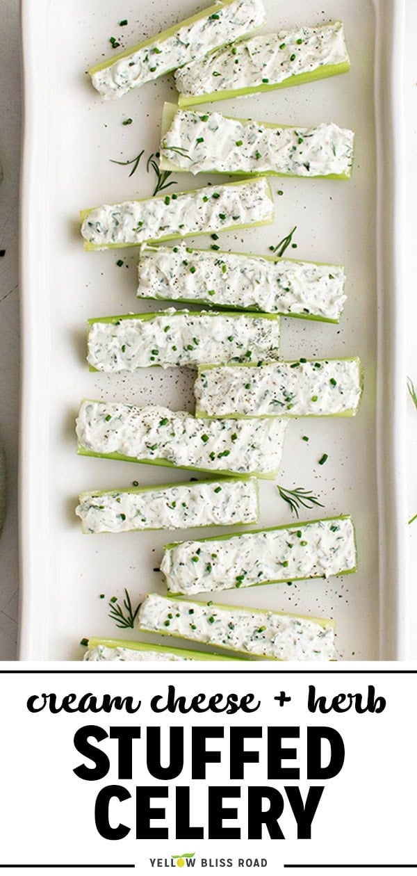 - Stuff celery sticks with the cream cheese mixture, using a small spoon or spreader. Garnish with cracked black pepper and fresh chopped herbs, arrange on a platter and serve.