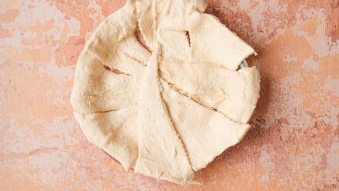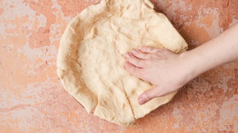 Press the dough into the bottom of the pan with your fingers and pinch the seams together. Make sure there are no gaps or holes. Fold the edges over if needed to shape the pie.