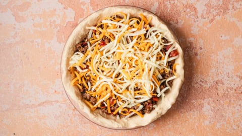- Pour the beef mixture on top of the crust. Top with the shredded cheeses and bake at 350 degrees for 25-30 minutes until the crust has browned and the cheese is melted and bubbly.
