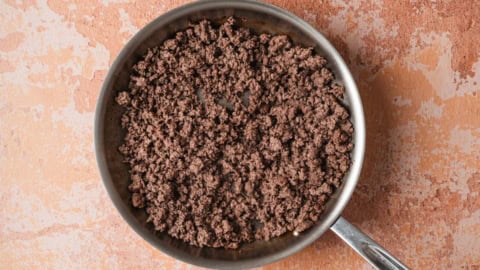 Cook the ground beef in a large skillet over medium heat until it’s browned, about 5 to 8 minutes. Break it up as it cooks for an even texture.