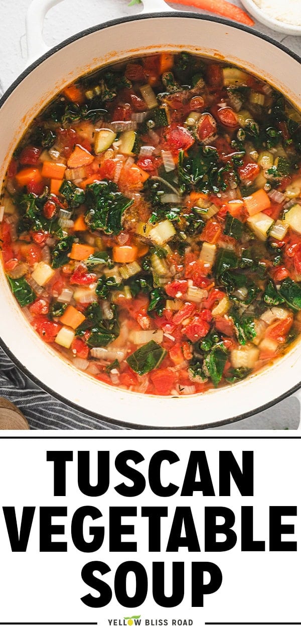Tuscan vegetable soup typically includes white beans (like cannellini), Italian vegetables (onion, carrot, celery, zucchini), tomatoes, leafy greens (kale or spinach), and Italian herbs in a savory broth. It’s a hearty, wholesome soup that’s both filling and nutritious.
