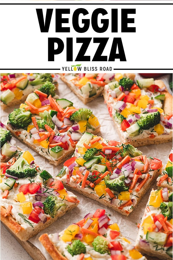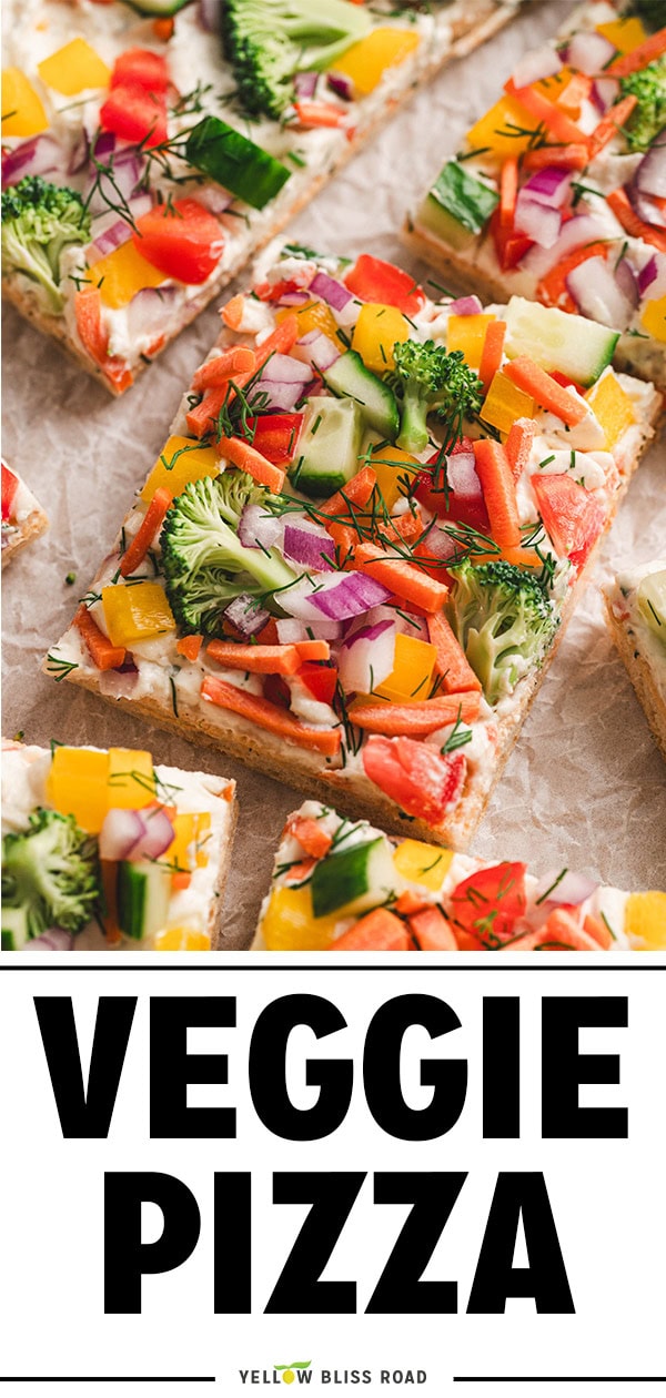- Top with the veggies and gently press into the cream cheese, sprinkle with a few pinches of freshly chopped dill if desired. Cut the pizza into 12 squares for larger portions, or cut the squares into triangles to make 24 small appetizer size servings. Serve immediately, or refrigerate and enjoy cold.