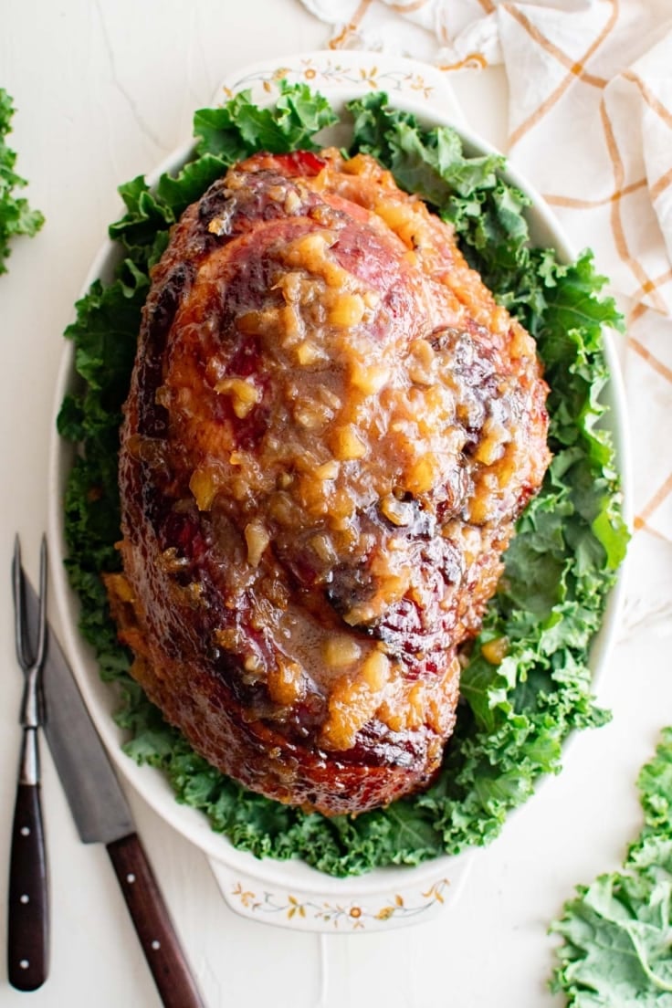 A bone-in spiral cut ham baked with a sweet, sticky brown sugar and pineapple glaze. Easy enough for a weeknight, impressive enough for any holiday table.