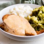 Bring to a low boil and let simmer over medium heat for 3-4 minutes or until sauce is reduced by half. Whisk in Dijon mustard and remaining 1 cup of chicken broth. Simmer until thickened, then remove from heat and stir in the sour cream. Settle chicken back into the same pan with the sauce, and spoon some over the top. Sprinkle with fresh minced parsley and serve immediately with mashed potatoes and sautéed veggies. Garnish with fresh minced parsley if desired.