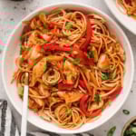 Add in the sauce and quickly bring to a boil. Add in the cooked noodles and cooked chicken and toss to evenly coat. Remove from heat and garnish with thinly sliced green onion.