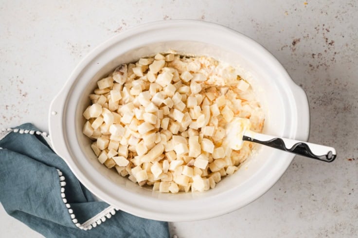 Add the frozen diced potatoes, sour cream, cream of chicken soup, diced onion, Parmesan cheese, and 2 cups of the cheddar cheese to the slow cooker. Season with salt, pepper, and garlic powder. Stir until the potatoes are completely coated.