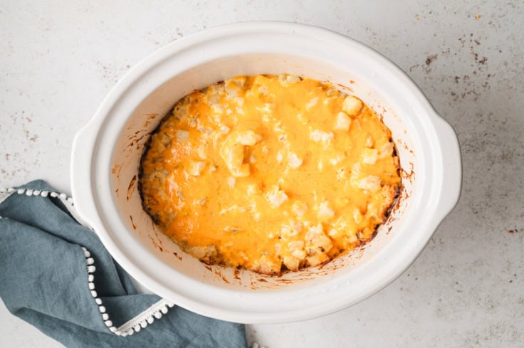 Cover and cook on LOW for 4 hours. Do not cook on high, as the dairy will curdle and the cheese can burn onto the sides of the slow cooker.