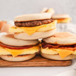 Assemble the sandwiches by placing an egg slice onto the bottom half of an English muffin. Top with a slice of cheese, followed by a slice of bacon, sausage or Canadian bacon. Top with the top half of the English muffin.