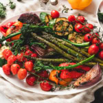 Let the vegetables marinate while the grill finishes heating. Once the grill is hot, add the zucchini, bell peppers and red onion and grill for 5-7 minutes, turning occasionally. After 5-7 minutes add the asparagus spears, broccolini and tomatoes to the grill and cook for another 5-10 minutes, or until all of the vegetables are tender to your liking and beginning to char. Remove the vegetables to a platter as they become done.