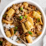 Meanwhile, heat another 12-inch skillet over medium-high heat with a tablespoon of butter. Add cabbage, carrots, baby corn, water chestnuts, 1 tablespoon minced garlic and ½ tablespoon minced ginger. Season with a pinch of salt and pepper. Cook, stirring frequently, until cabbage is tender.