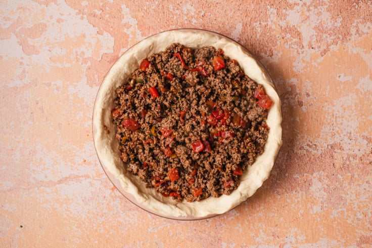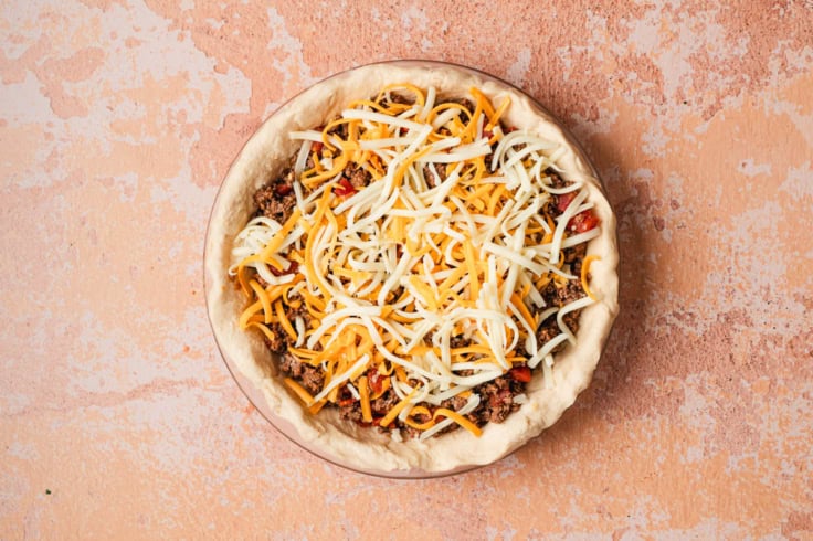 Pour the beef mixture on top of the crust. Top with the shredded cheeses and bake at 350 degrees for 25-30 minutes until the crust has browned and the cheese is melted and bubbly.