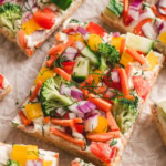 Top with the veggies and gently press into the cream cheese, sprinkle with a few pinches of freshly chopped dill if desired. Cut the pizza into 12 squares for larger portions, or cut the squares into triangles to make 24 small appetizer size servings. Serve immediately, or refrigerate and enjoy cold.
